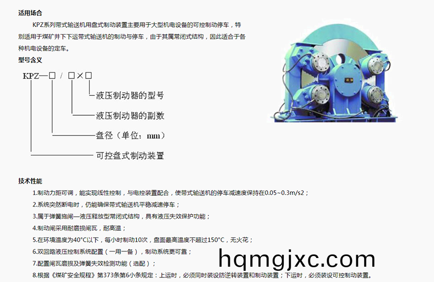 KPZ係列製(zhi)動器主(zhu)要用于下(xia)運(yun)帶式輸送機或大傾角上運式輸送機(ji)等(deng)大型機電設(she)備的可控製(zhi)動與停車,